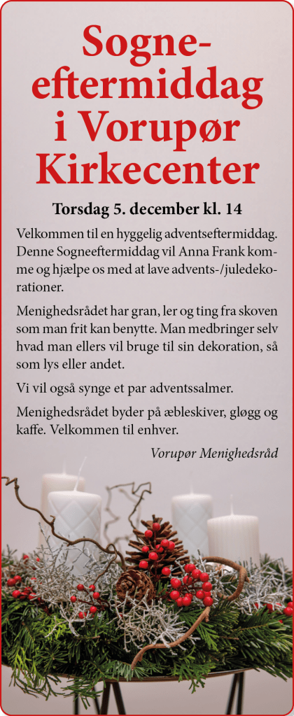 Sogneeftermiddag i Vorupør Kirkecenter . hjvvvvkirkerne Uncategorized Kommentarer lukket til Sogneeftermiddag i Vorupør Kirkecenter Torsdag d. 5 december 2024 kl. 14:00 Del dette: Share on X(Åbner i et nyt vindue) X Del på Facebook(Åbner i et nyt vindue) Facebook Like Henter... Relateret