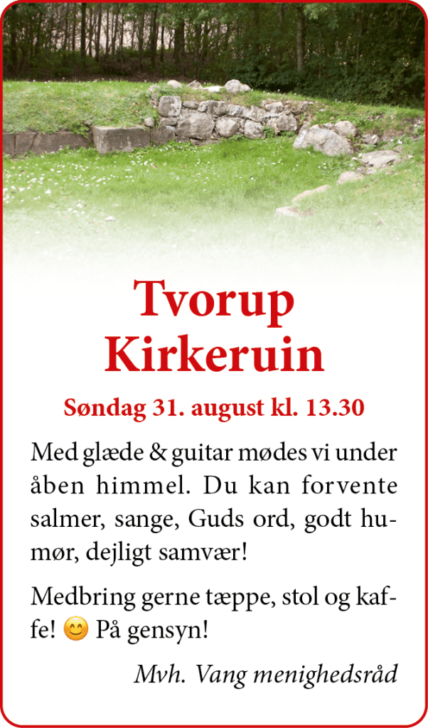 Friluftsgudstjeneste v. Tvorup Kirkeruin . hjvvvvkirkerne Uncategorized Kommentarer lukket til Friluftsgudstjeneste v. Tvorup Kirkeruin Søndag d. 31 august 2025 kl. 13:30 Del dette: Click to share on X(Åbner i et nyt vindue) X Klik for at dele på Facebook(Åbner i et nyt vindue) Facebook Like Henter... Relateret