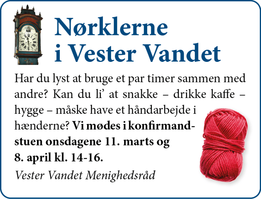 Nørklerne i Vester Vandet . Mortenhh Uncategorized Kommentarer lukket til Nørklerne i Vester Vandet Onsdage 11. marts og 8. april kl. 14-16 Del dette: Share on X(Åbner i et nyt vindue) X Del på Facebook(Åbner i et nyt vindue) Facebook Like Henter... Relateret